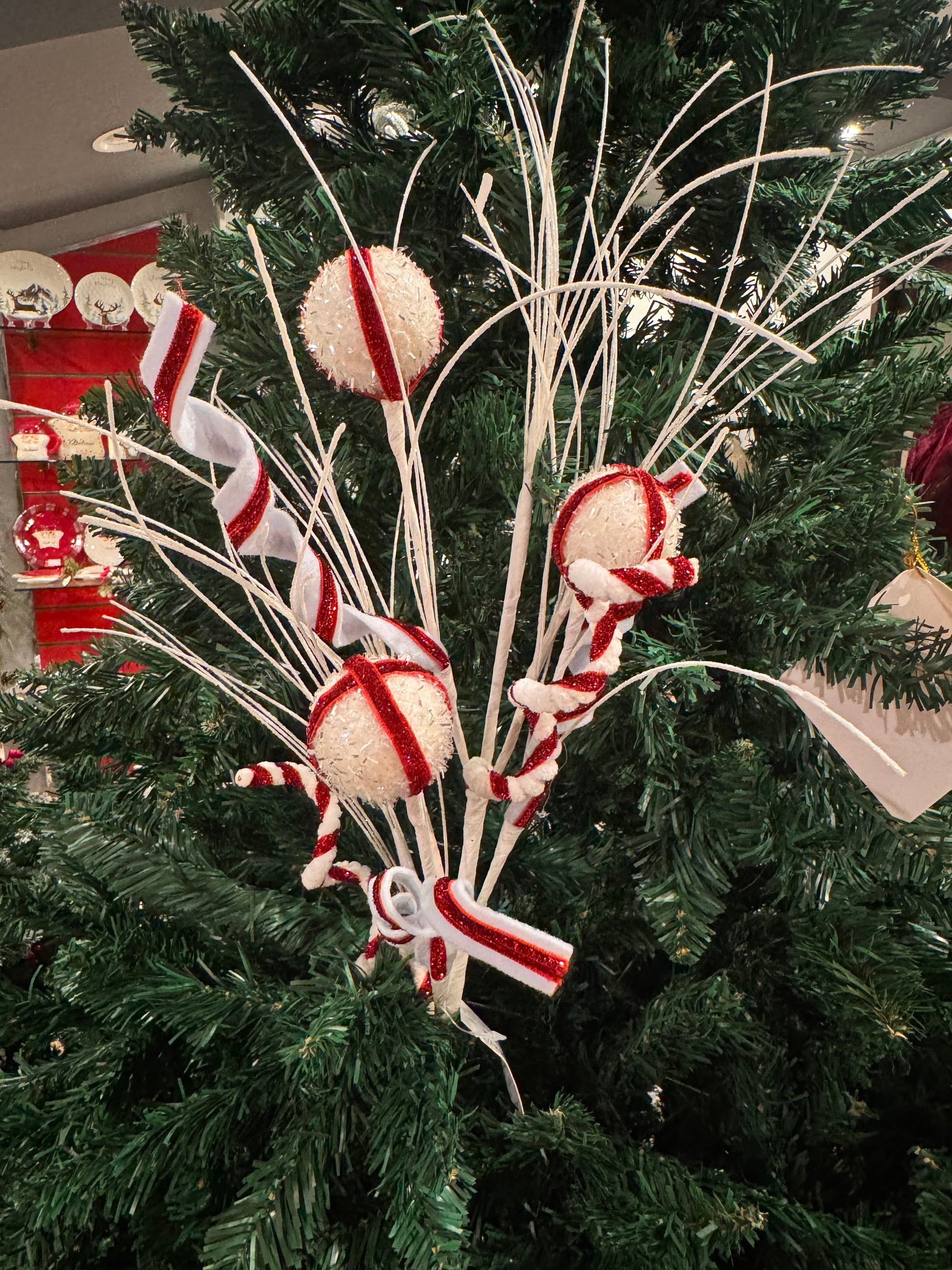 A whimsical candy-themed sprays dusted- stripped canes, lollipops, and swirls for a playful Christmas touch.