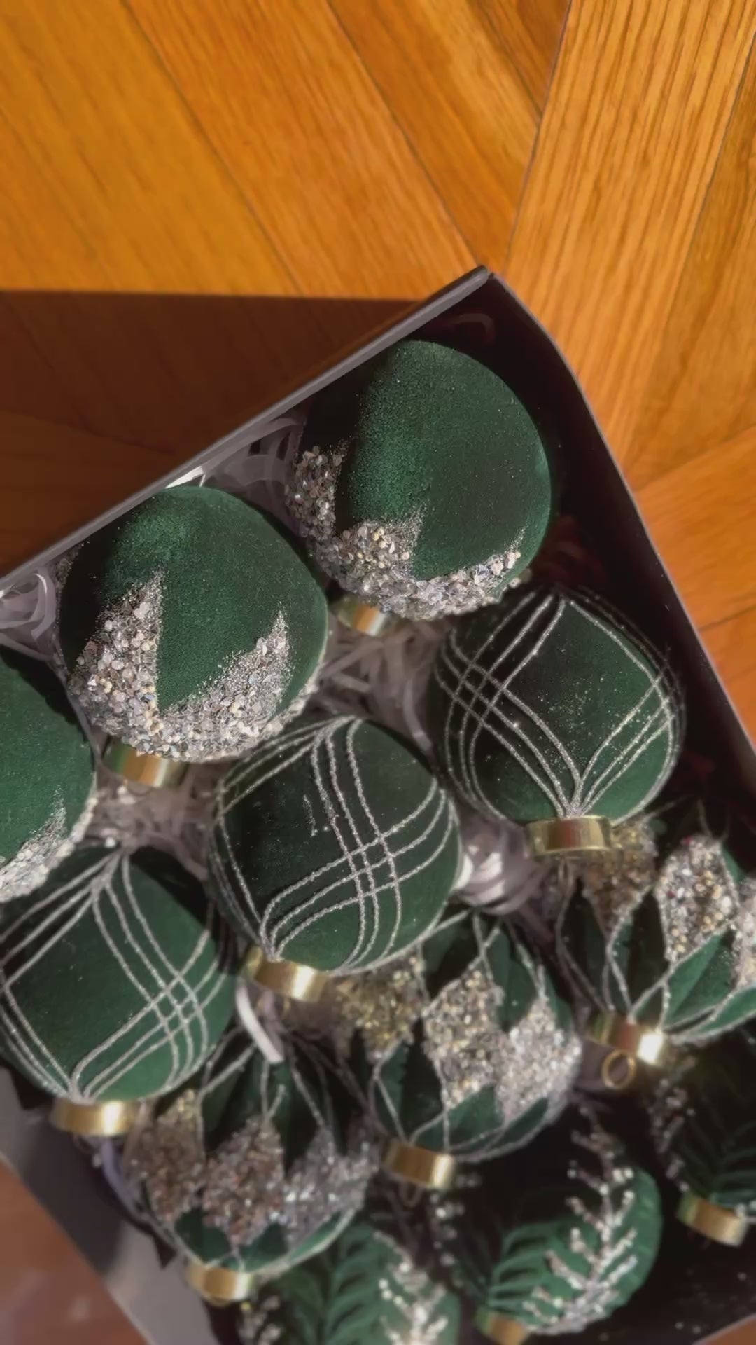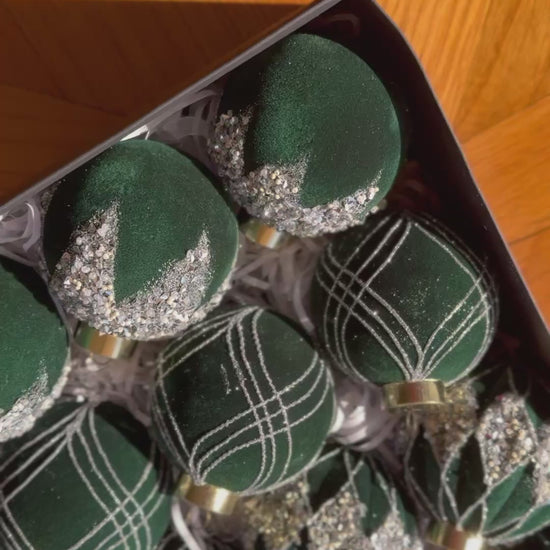A stunning collection of twelve dark green velvet ornaments embellished with sparkling mettalic glitter and intricate line patterns. This set combines rich textures and elegant shine to bring a luxurious, coordinated look to your Christmas tree.