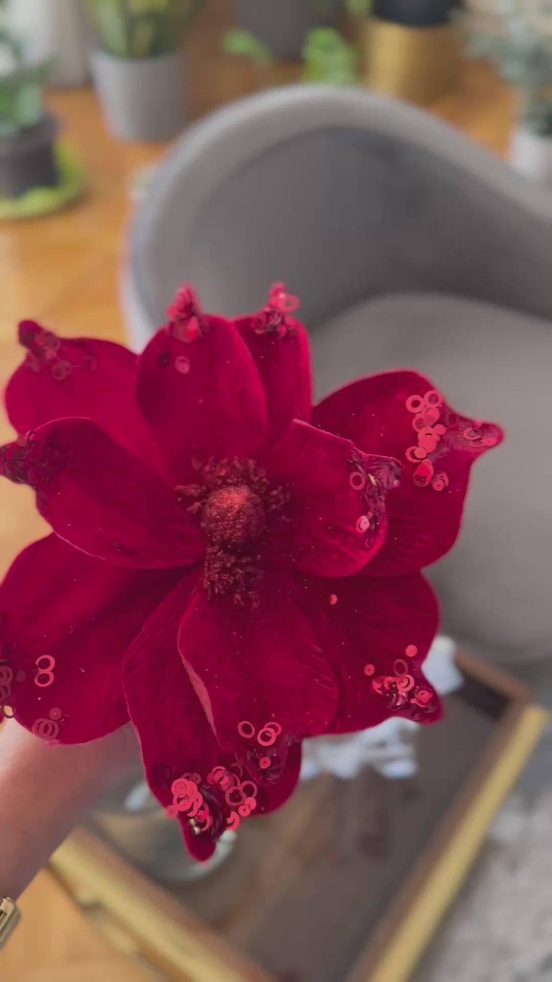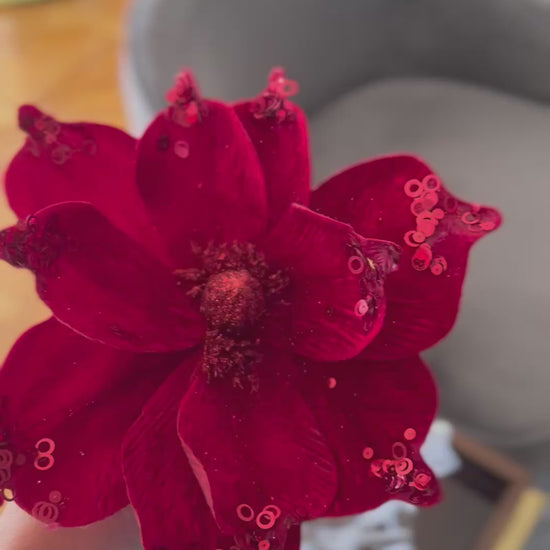 A deep-red velvet flower with shimmering sequins clustered at the petal edges, perfect for adding a festive sparkle to Christmas trees or wreaths.